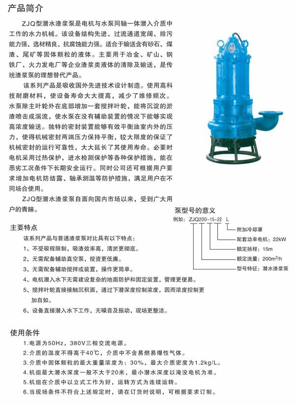 ZJQ型渣漿泵是電機與水泵同軸一體潛入介質中工作的水利機械。該設備結構先進、過流通道寬闊、排污能力強;選材精良、抗腐蝕能力強。適合于輸送含有砂石、煤渣、尾礦等固體顆粒的液體。主要用于冶金、礦山、火力發電廠等企業渣漿類液體的清除及輸送,是傳統渣漿泵的理想替代產品。